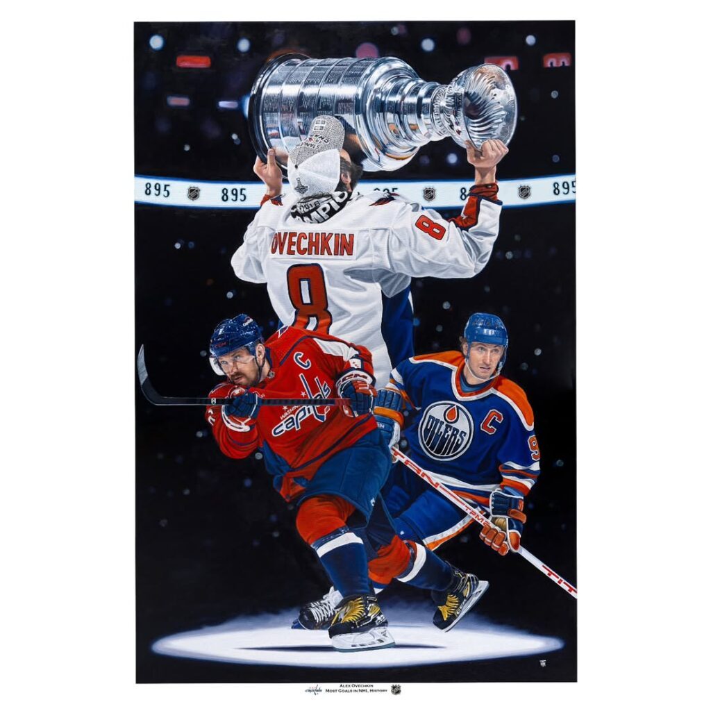 Dielo zachytáva dve ikonické scény: v pozadí je Ovečkin so Stanley Cupom z roku 2018 nad hlavou a v popredí jeho typický tvrdý príklep s Waynom Gretzkym v drese Edmontonu korčuľujúcim za ním. Práve v tomto drese Gretzky nastrieľal 583 zo svojich 894 gólov.