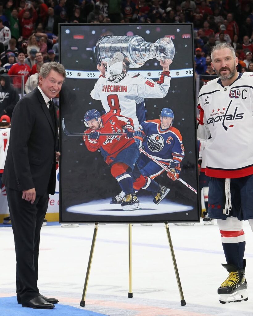 Po rekordnom góle č. 895 čakala na Ovečkina ďalšia pocta. Počas ceremoniálu na ľade mu komisár NHL Gary Bettman odovzdal veľkoformátový obraz od renomovaného športového umelca Tonyho Harrisa.